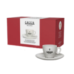 Cutie cu 4 cești de cappuccino și 4 farfurioare, cu sigla Gaggia.